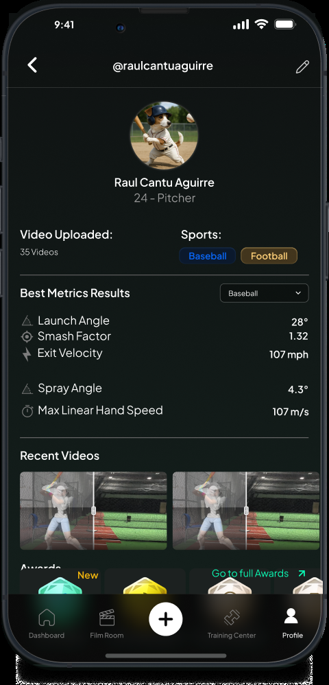 A user’s sportFX profile displaying their sports and key performance metrics. Athletes can have multiple sports (e.g. Baseball and Football) associated with their profile, and sportFX will track sport-specific metrics like launch angle, exit velocity, and more. The profile also shows total videos uploaded and recent sessions, helping users and coaches review progress.